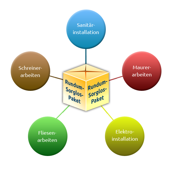 Das » Rundum-Sorglos-Paket « ist ein besonderer Service der Firma Stumm: Ein Komplettangebot in Sachen Bad und die perfekte Koordination aller Gewerke bei der Badgestaltung, oder -sanierung, die auch Maurer-, Fliesen- und Elektroarbeiten, sowie Schreinerarbeiten umfasst. Das Bad wird dem Kunden nach Beendigung aller Arbeiten quasi „schlüsselfertig“, zur sofortigen Nutzung übergeben.
